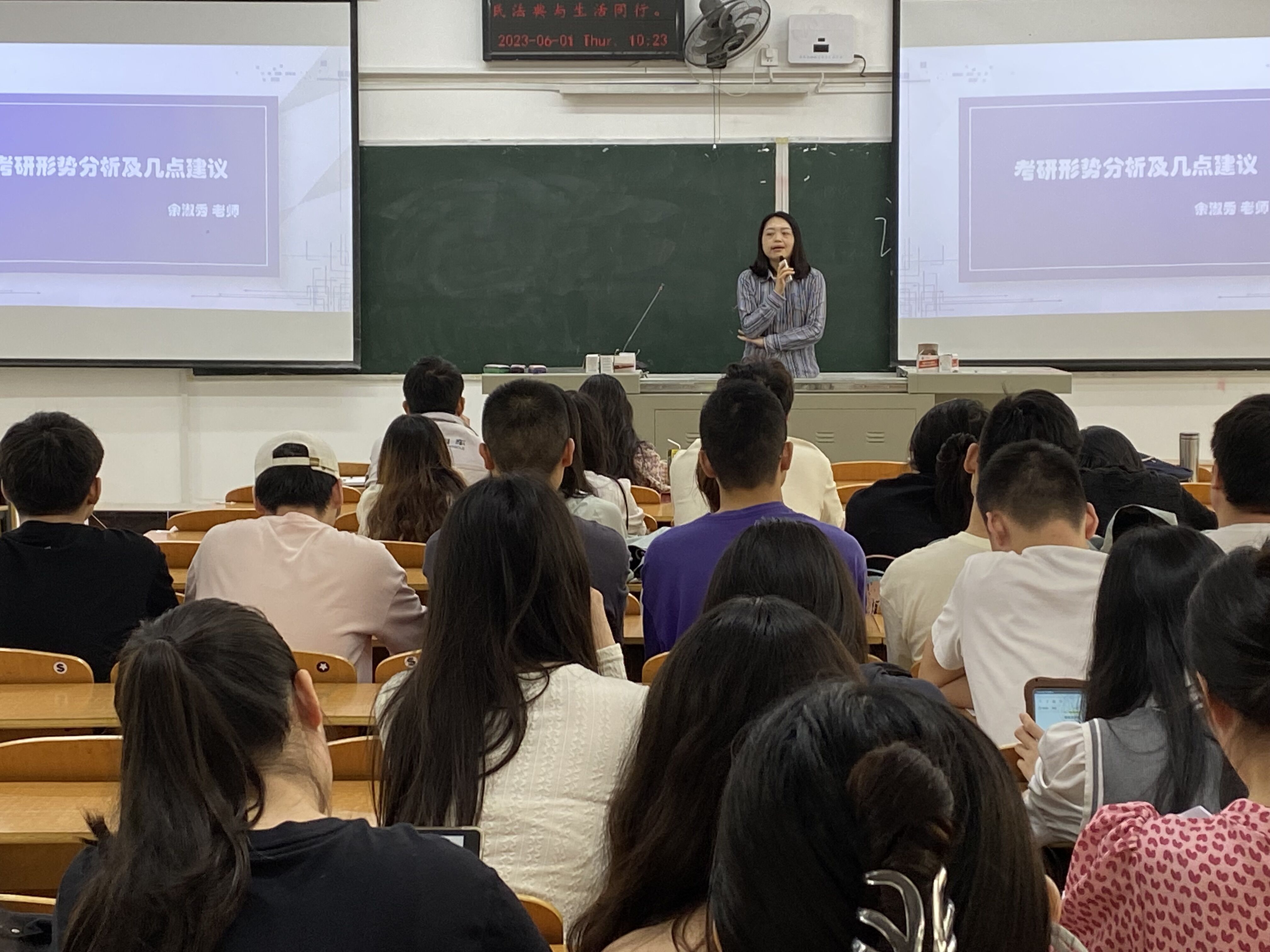 随后,余淑秀从考研的学校地理位置、设有专业、初复试试题等多个角度为同学们分析当前考研面临的困境及形势,并提出“广泛了解院校及专业”“定位实事求是”“复习以真题为主”“把同学作为考研同伴”等合理化建议。程文明以“考研考哪里?”为主题,再次强调了考研的重要意义,提出了如何选择考研院校及专业的合理化建议,重点介绍了我校开设的统计学学硕专业,鼓励大家积极报考本校研究生。