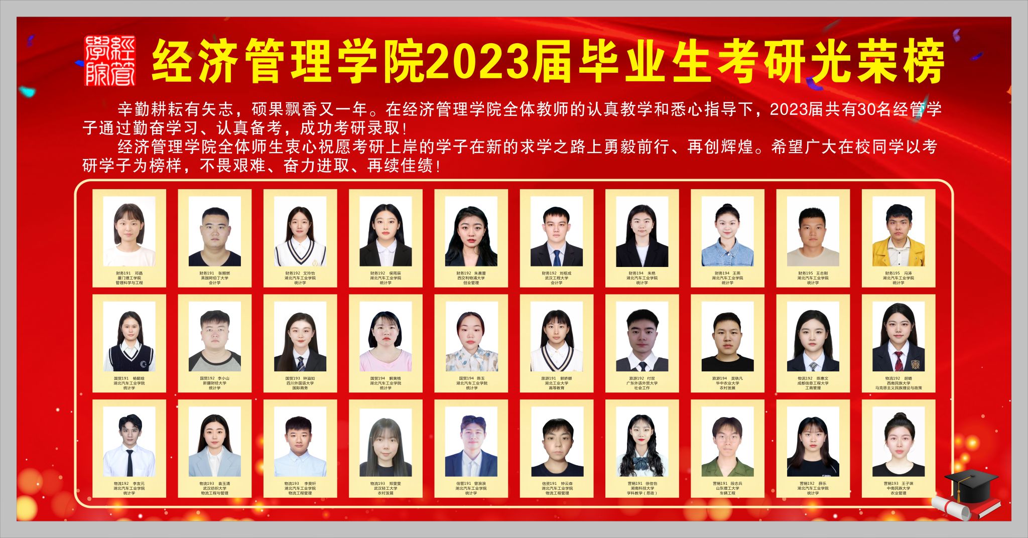经济管理学院全体师生衷心祝愿考研上岸的学子在新的求学之路上勇毅前行、再创辉煌。希望广大在校同学以考研学子为榜样,不畏艰难、奋力进取、再续佳绩!