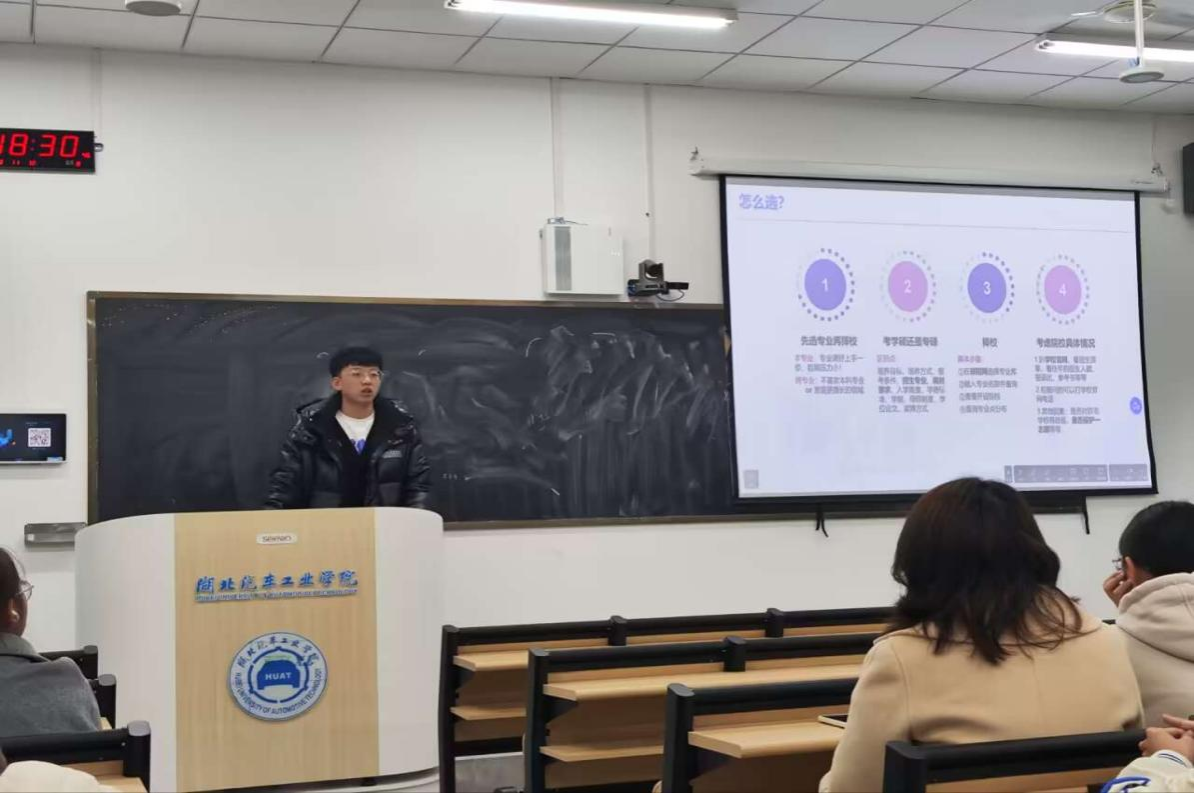 2024年全国考研报名已经结束,为全面调动经济管理学院广大学子考研积极性,营造新一轮备战考研的良好学习氛围,帮助2025届同学们了解考研形势,掌握备考方法,2023年11月12日晚,经济管理学院选派10名研究生优秀党员代表,利用周日晚自习时间,为经济管理学院大三共33个班,共计1011学生,在南校区和北校区分别开展共12场考研动员交流会,以实现2025届学生考研动员全覆盖。经济管理学院分党委副书记周丹、副院长胡姜、学工办主任张倩、分团委书记吴文斌、学工办卓安翼老师、以及部分大三班主任参加了此次活动。