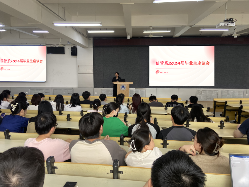 信管系于2024年5月21日下午三点在6113教室开展了2024届毕业生座谈会,旨在为即将步入社会的毕业生们提供一个交流思想、分享经验的平台。本次座谈会由信管系主任王红英副教授主持,大数据管理与应用负责人林璇、信息管理与信息系统专业负责人郑珊珊、大数据专业班主任徐康老师、信管系辅导员陈欢老师参与,信管系百余位学生共同探讨未来的职业规划与发展方向。