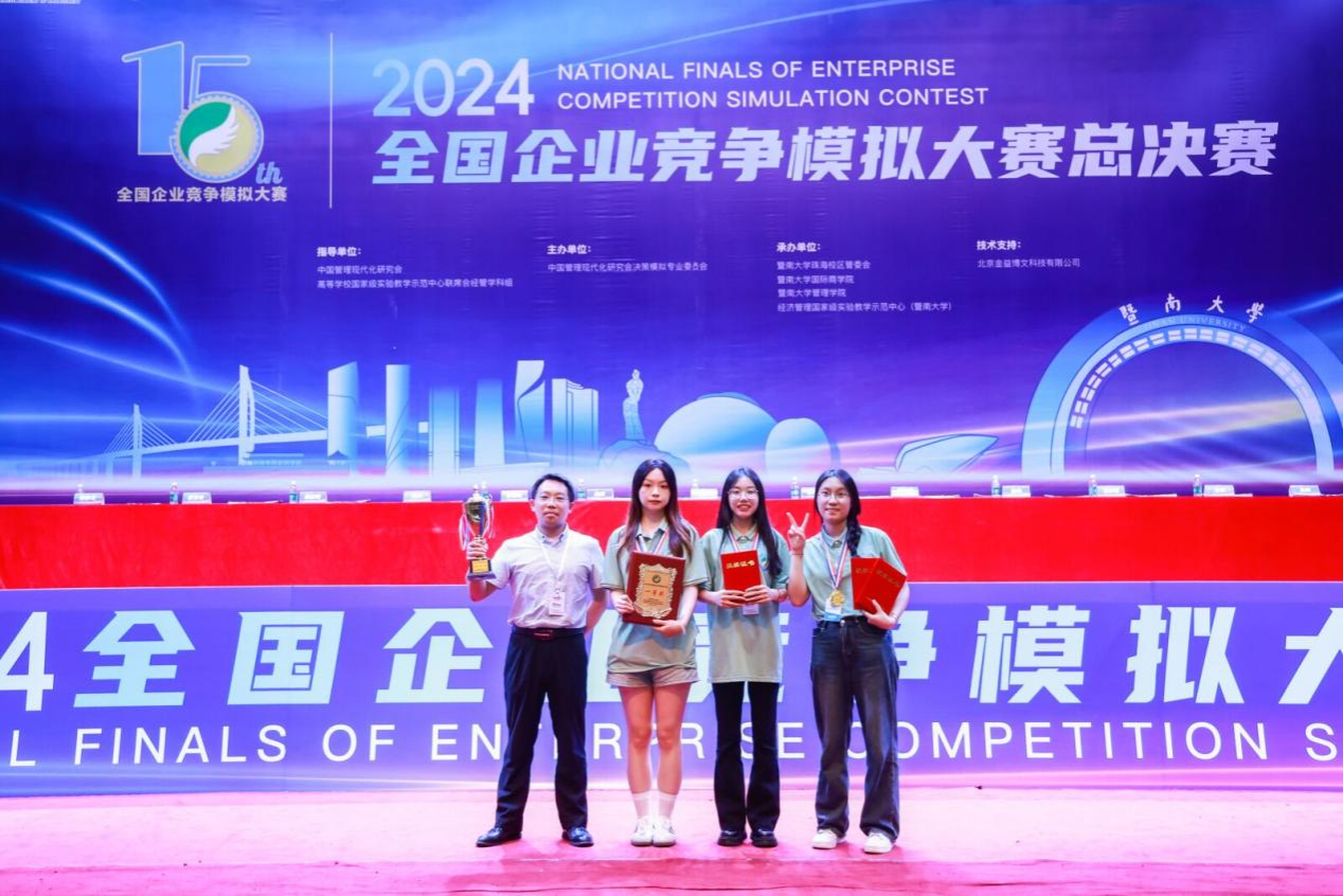 近日,2024年全国企业竞争模拟大赛总决赛在暨南大学圆满结束,我校经济管理学院荣获本科组国奖18项,研究生组国奖4项。其中全国一等奖1项,全国二等奖11项,全国三等奖10项。同时我校也获得赛事优秀组织奖。
