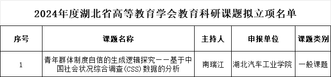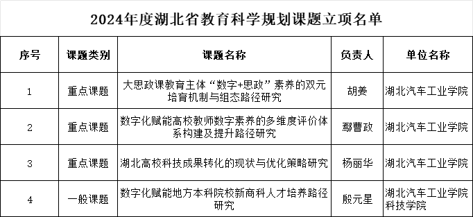 近日,湖北省教育厅公布了 2024 年度湖北省教育科学规划课题及湖北省高等教育学课题评审结果,经济管理学院再创佳绩,教育科学规划课题获批 4 项课题,包含 3 项重点课题与 1 项一般课题;湖北省高等教育学会获批1项课题,这一成果反映了学院在教育教学研究领域有着较为稳定的表现和一定的影响力,为学院教育教学研究工作的持续推进奠定了良好基础。