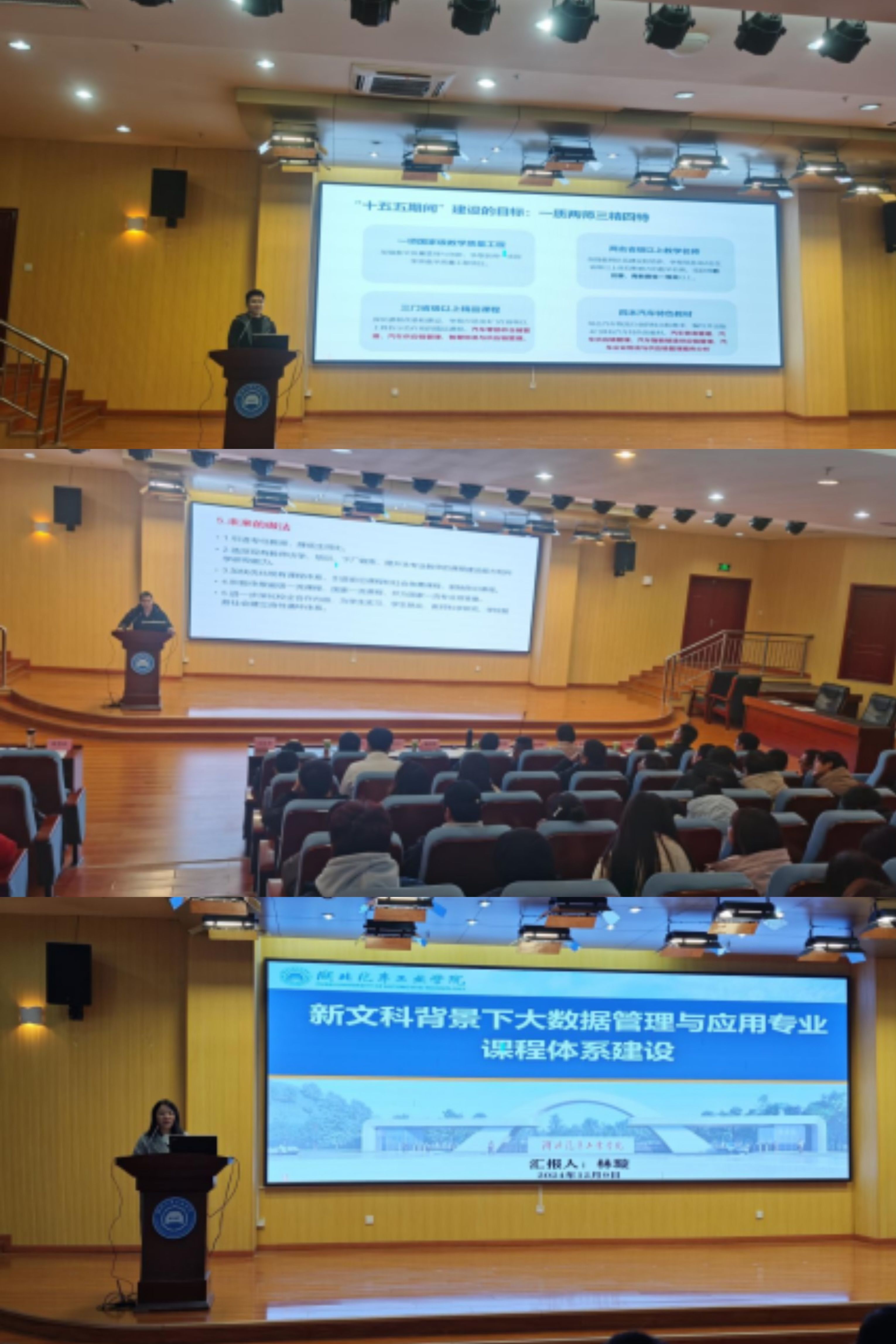 随后,物流管理专业负责人王新宇、国际经济与贸易专业负责人程文明、大数据管理与应用专业负责人林璇等三位老师依次上台发言,详细介绍各专业的发展历程、专业建设的成就与经验,以及专业定位、课程体系、实践教学、师资队伍、教学创新、产教融合、专创融合、国际交流、专业认证等方面的主要工作及具体做法,并提出未来专业规划及下一步主要任务。