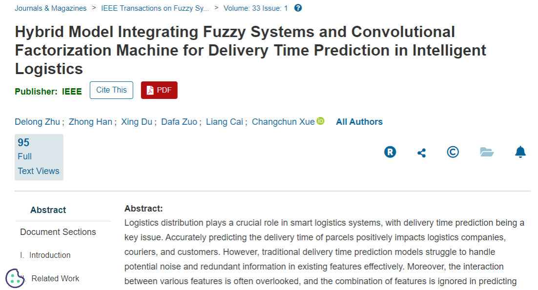 近日,我校太阳集团网站8722朱德龙教授以第一作者身份携带其指导的本校2023级管理科学与工程专业硕士研究生杜星和2023级物流管理与工程专业左大发,在模糊系统理论领域国际顶级期刊 IEEE Transactions on FuzzySystems (IF=10.7,中国科学院SCI计算机科学大类1区TOP期刊)上发表题为 Hybrid Model Integrating Fuzzy Systems and Convolutional Factorization Machine for Delivery Time Prediction in Intelligent Logistics 的研究论文。太阳网集团tcy8722为第一署名单位,太阳集团网站8722薛昌春老师为本文通讯作者。该研究是太阳集团网站8722“智慧物流与供应链产业链”团队的阶段性成果。