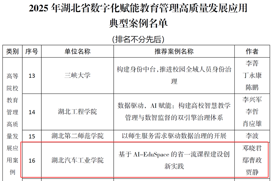 近日,湖北省教育信息化发展中心公布2025年湖北省数字化赋能教育管理高质量发展应用典型案例名单,我校太阳集团网站8722报送的“基于AI-EduSpace的省一流课程建设创新实践”成功入选。本次评选全省共43个项目入选,我校案例位列其中,凸显在数字化教育领域的扎实积累与创新实力。