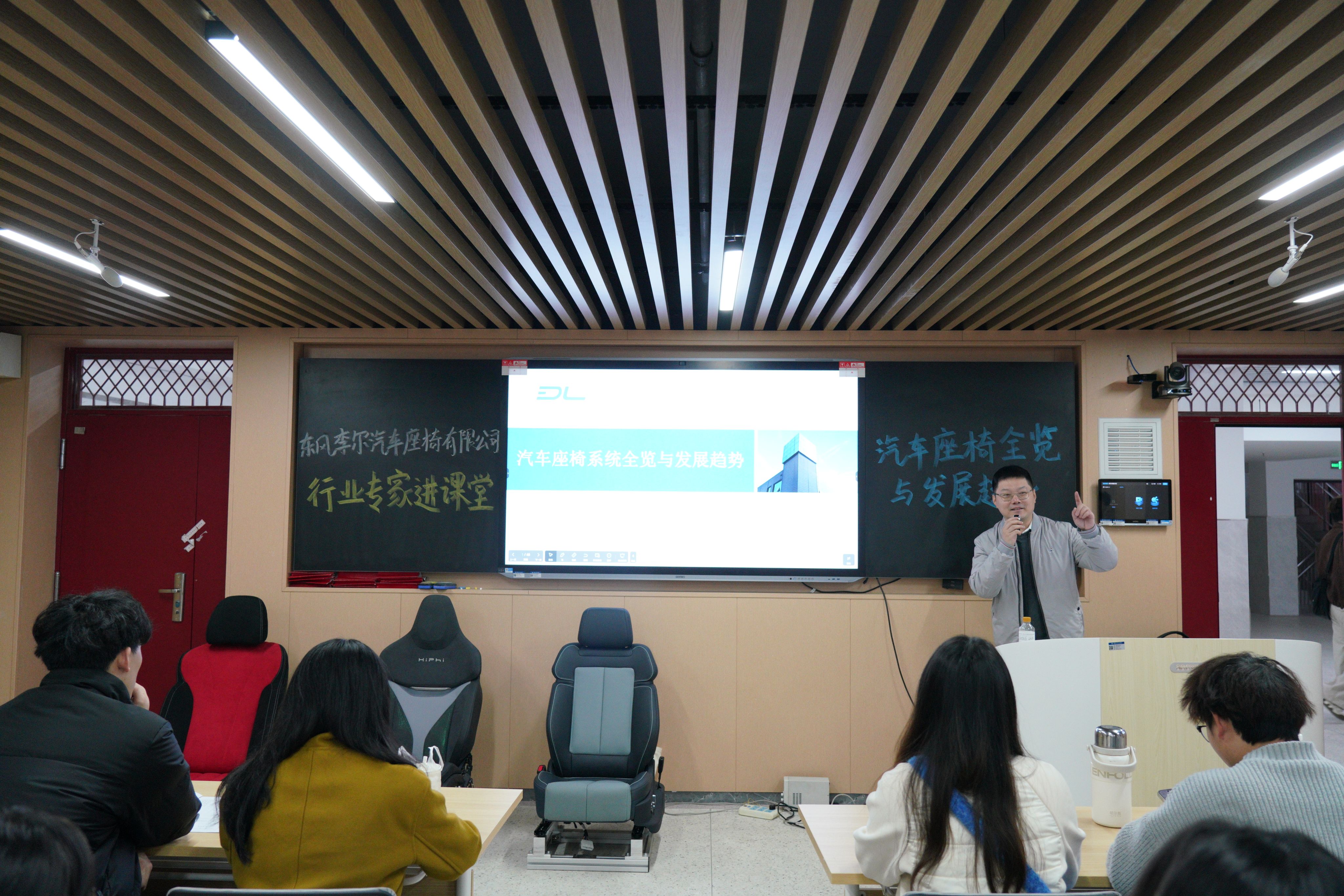 首场活动特邀东风李尔座椅研发院创新中心主任工程师江超靖担任主讲。他以“汽车座椅系统全览与发展趋势”为题,向物流工程与管理专业2024级研究生系统讲解了汽车座椅的技术体系与前沿动态,将真实的产业案例与研发经验带进课堂,有效拓宽了学生的专业视野。同时,东风李尔面向毕业生启动了校园招聘,为在读研究生提供了实习岗位,无缝对接专硕专业实践培养环节,实现了学习、实践与就业的紧密联动。