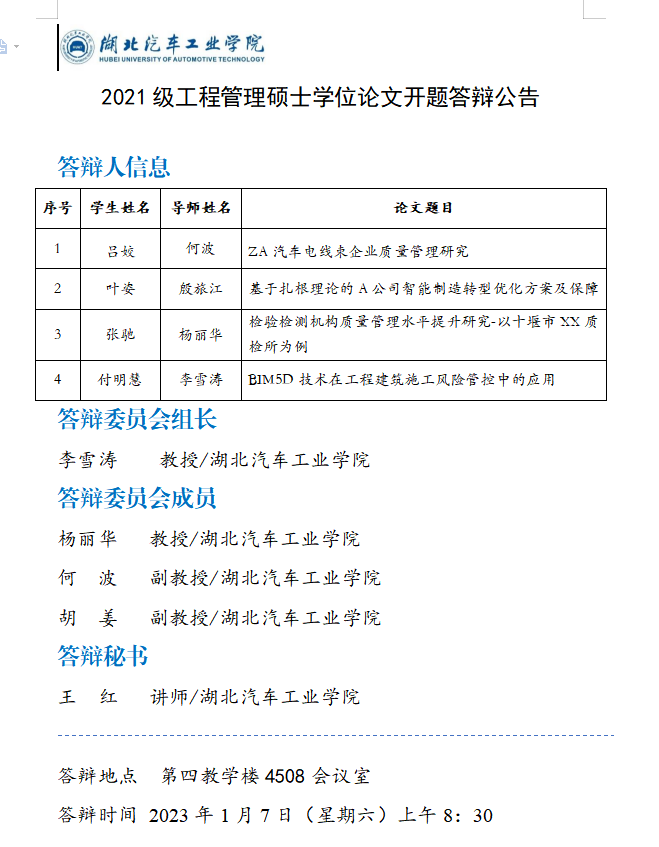 工程管理专业2021级硕士研究生学位论文开题答辩公告(一)