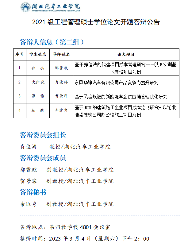 工程管理专业2021级硕士研究生学位论文开题答辩公告(二)