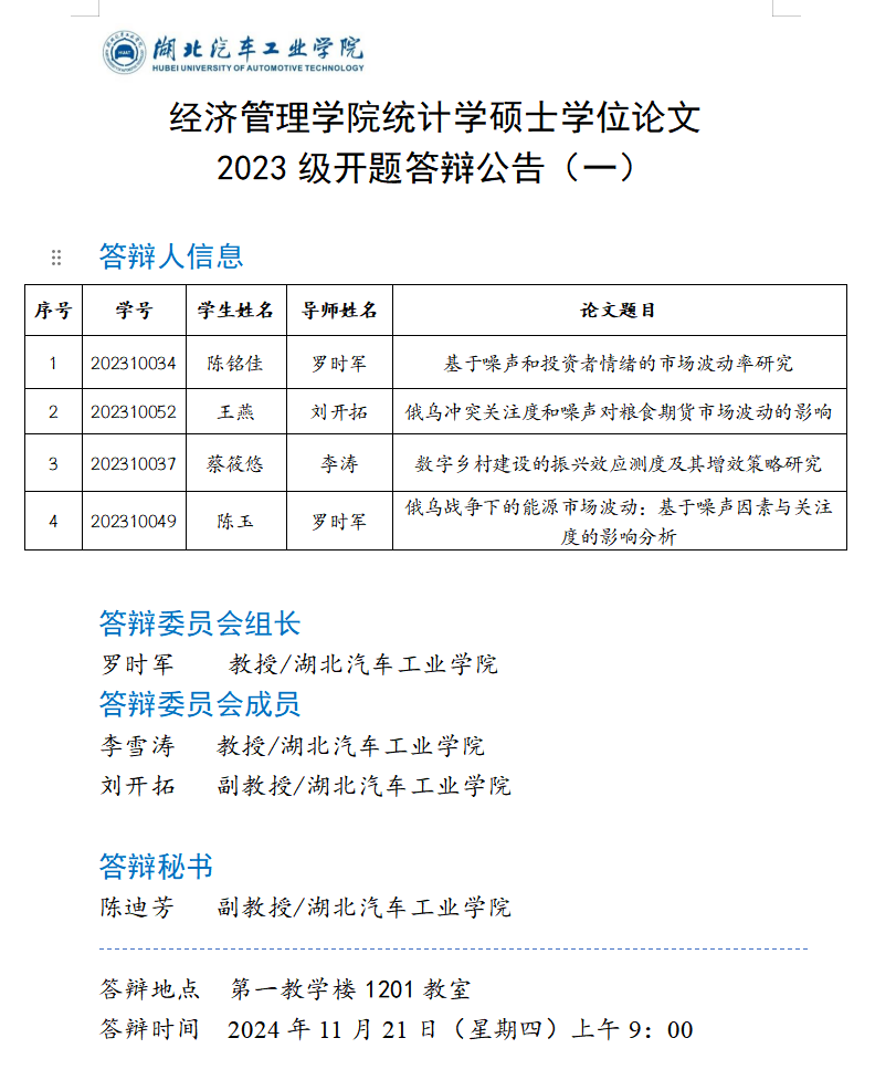 统计学硕士学位论文2023级开题答辩公告(一)