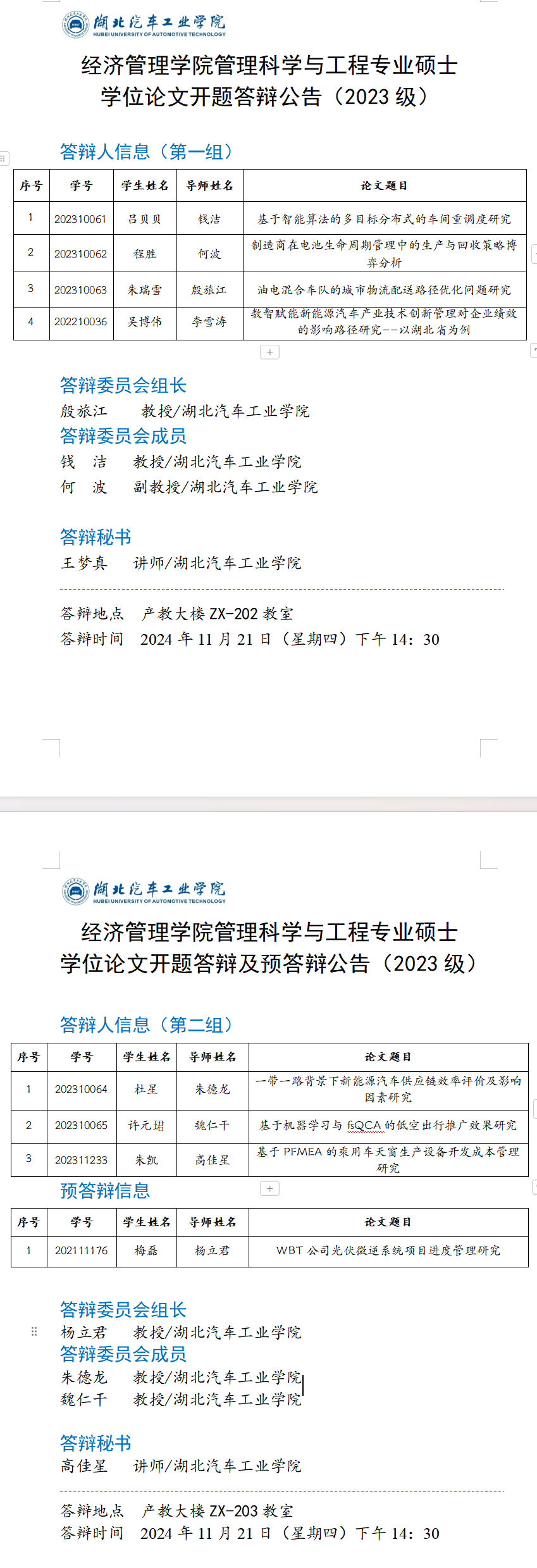 管理科学与工程专业硕士学位论文开题答辩公告(2023级)