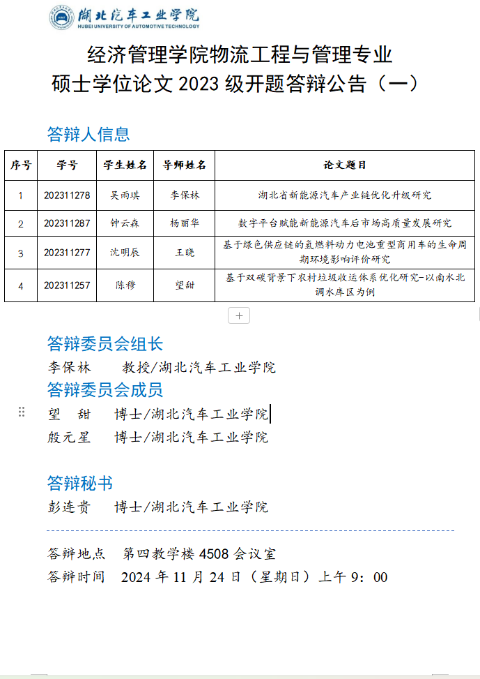物流工程与管理专业硕士学位论文2023级开题答辩公告(一)