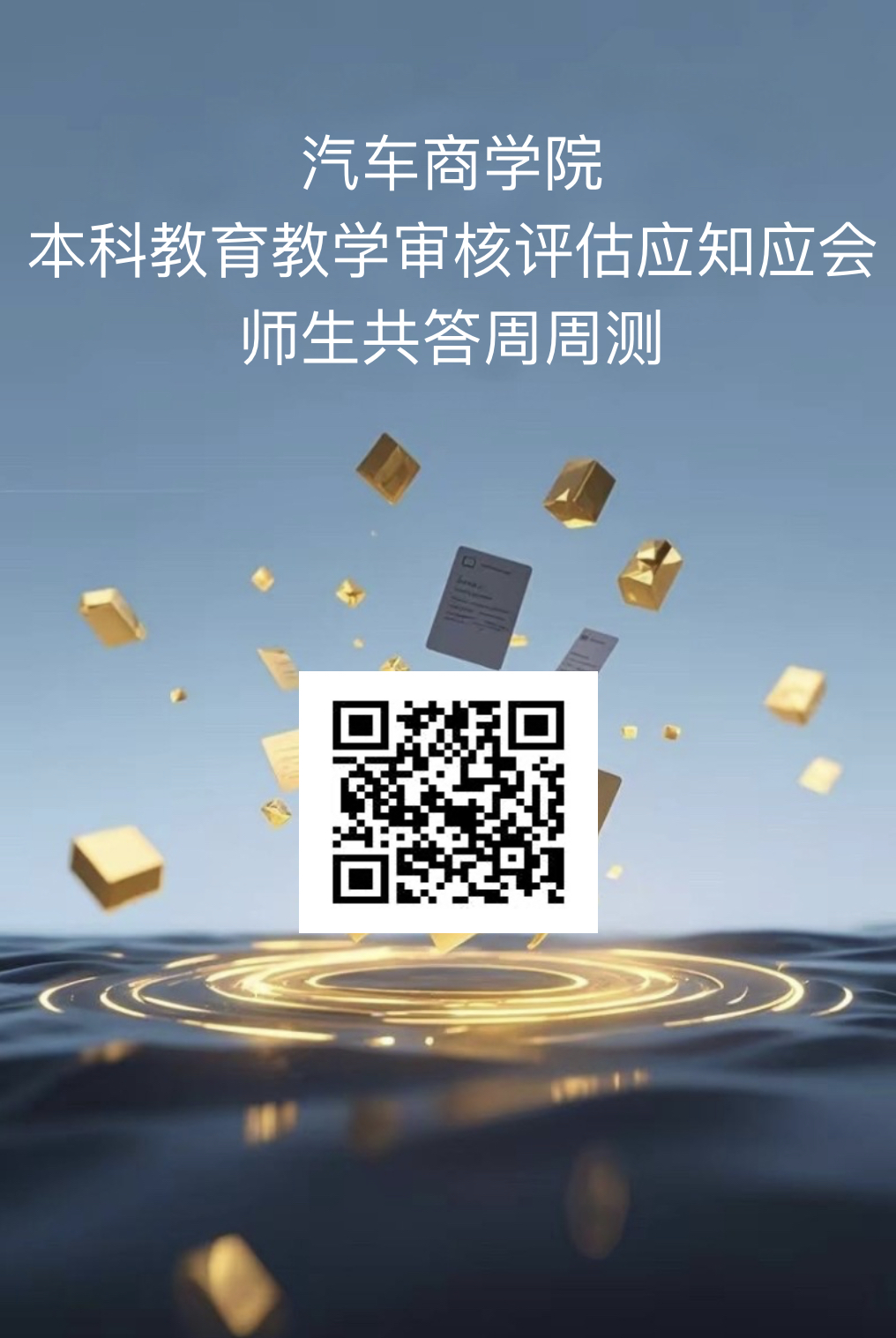 为迎接本科教育教学审核评估,促使全院师生深入了解评估要点,现举办“应知应会师生共答周周测”活动。这不仅是一次知识的回顾,更是对学院发展共识的凝聚。让我们共同参与,以测促学,为夯实本科人才培养基础、建设汽车特色鲜明的商学院贡献力量!