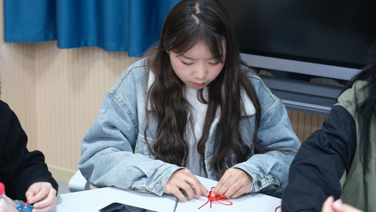 活动中,师生们还一起手工DIY中国结,一根根红绳经历对折、绕绳、打结等几十道“工序”后,在同学们手中演变成不同的绳结,交织的红线里凝聚着大家对团结、平安的美好祝愿。