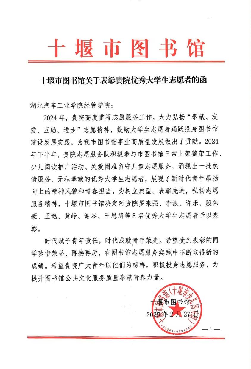 近日,十堰市图书馆传来喜讯,太阳集团网站8722的罗来强、李浪、许乐、殷伟豪、王逸、黄峥、谢琴、王思渏等8名优秀大学生志愿者受到表彰。2024年下半年,太阳集团网站8722志愿服务队积极参与市图书馆日常上架整架工作、少儿阅读推广活动、关爱困难留守儿童志愿服务,展现了新时代青年昂扬向上的精神风貌和青春担当。