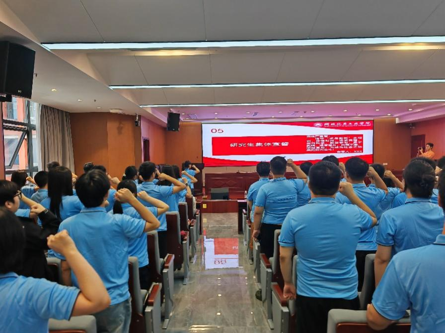 在杨欣璐领誓下,全体新生庄严宣誓,承诺恪守校训、追求真理、勤奋学习、勇于实践,为成为社会栋梁奋斗。