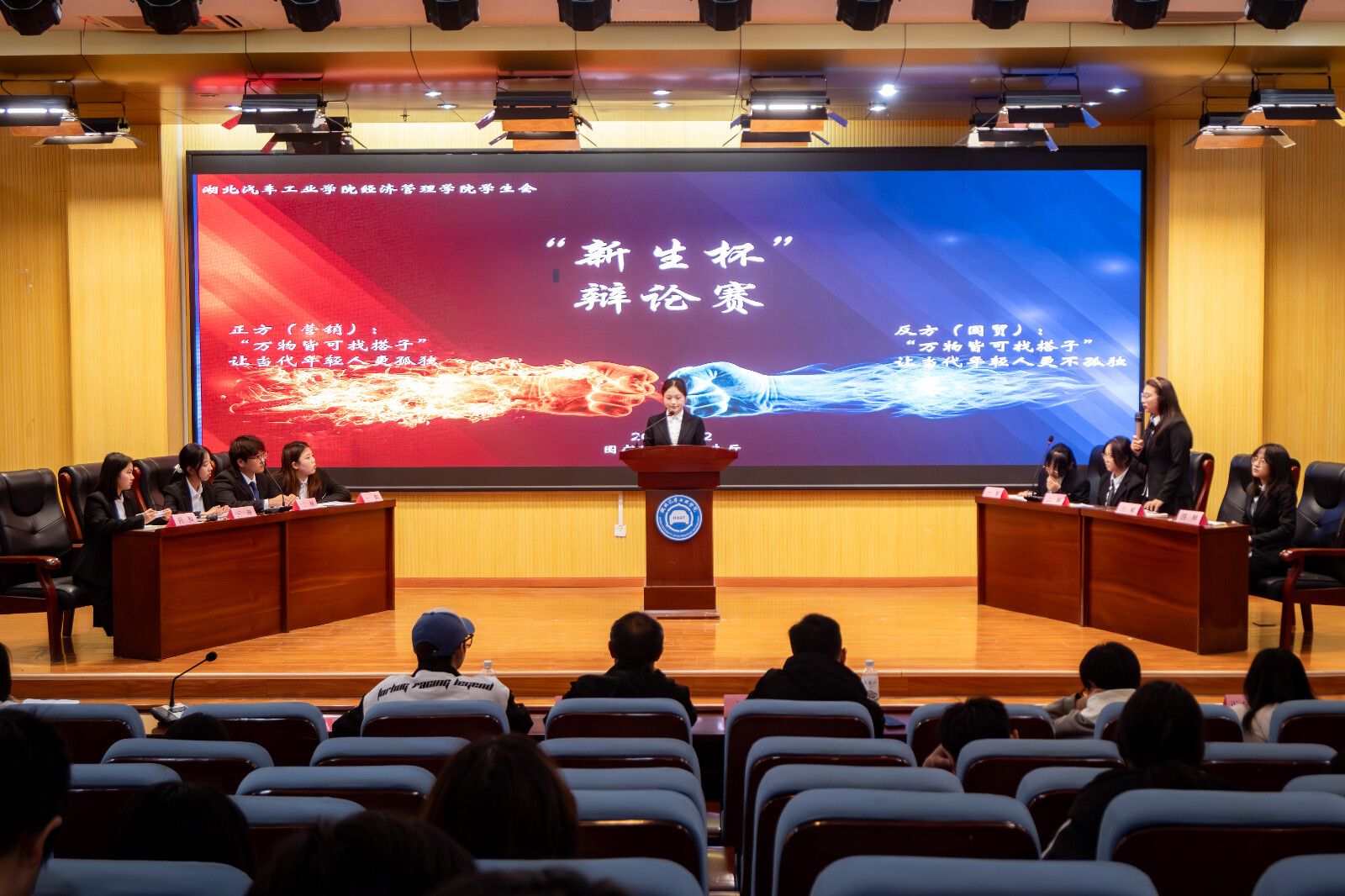 本次辩论赛的辩题为“万物皆可找搭子是否让当代年轻人更孤独”,正反双方围绕这一话题展开了激烈的交锋。比赛伊始,双方辩手迅速进入状态,在开篇立论环节中,各自清晰地阐述了自己的观点和论据。正方辩手言辞犀利,逻辑严密,以充分的事实和数据支持自己的观点;反方辩手也毫不示弱,他们思维敏捷,从不同的角度对正方观点进行了有力的反驳。双方辩手你来我往,唇枪舌剑,妙语连珠。他们不仅展现出了深厚的知识底蕴和出色的辩论技巧,还充分体现了团队合作精神。