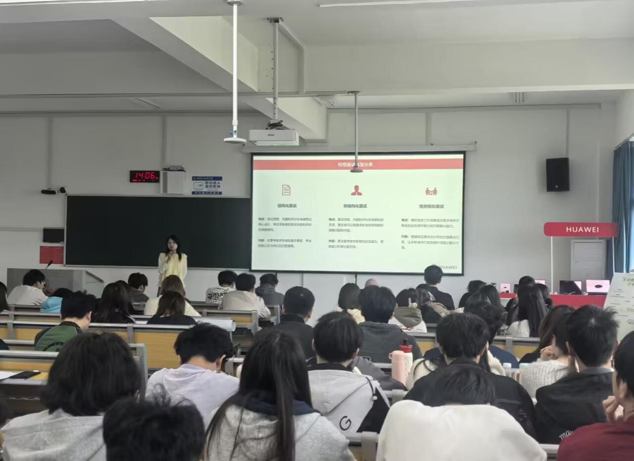讲解尾声,张娜女士结合慧通商务的招聘需求、企业文化及面试偏好,具体剖析面试重点与评分标准,通过真实案例让学子直观了解企业选人逻辑,提供针对性面试建议。整场活动务实高效、指导性强,有效缓解了同学们的求职焦虑,为同学们搭建了理论与实践衔接的桥梁。
