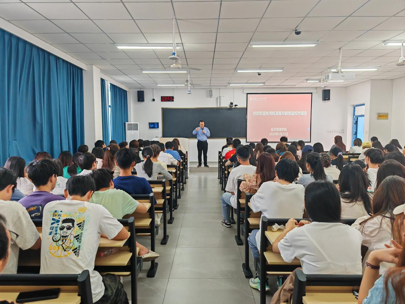 为提升学生的职业规划意识,帮助他们更好的树立人生目标。2024年9月29日上午,经济管理学院邀请我校杰出校友中央财经大学保险学院陈华教授(博士生导师)为23级旅游、国贸专业全体学生作校友事迹报告,分享会由经管学院赵氏璇老师主持。
