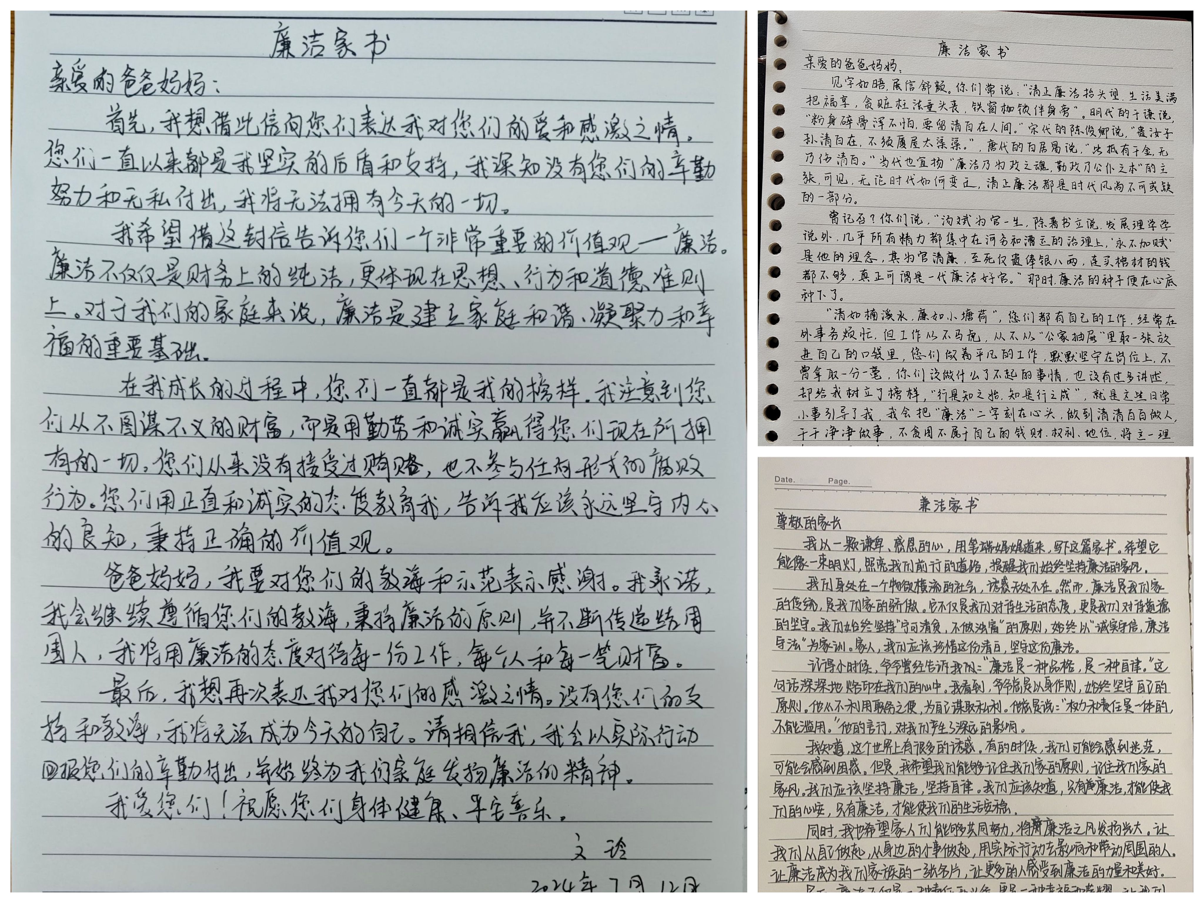 廉洁书信,共话清廉。学生党支部坚持贯通党纪学习教育与廉洁教育相结合,开展“廉洁”家书活动。学生党员结合党纪学习教育所思所悟撰写廉洁家书,用廉洁自律与家人共勉,以优良家风共建美好家园。