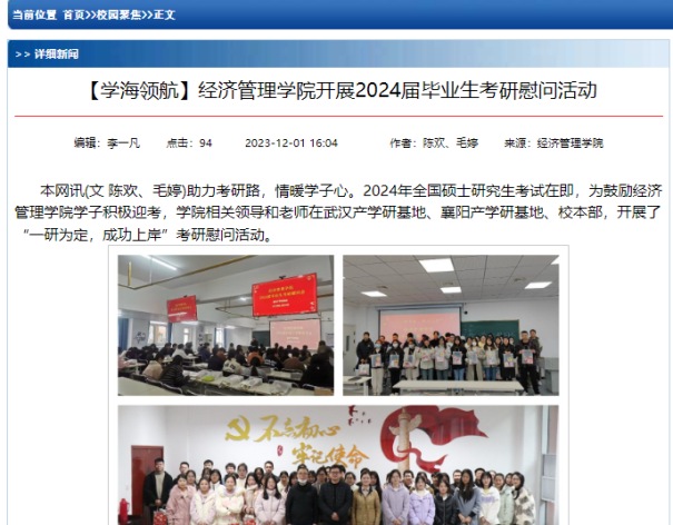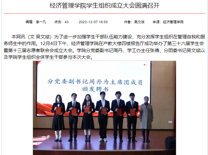 加强学院学风建设,深入推进学院“三全育人”工作,营造良好的学风、院风,学工办开展学生组织分享交流会、学生组织成立大会、开展“管理浪潮文化节”和2024届毕业生考研慰问活动。
