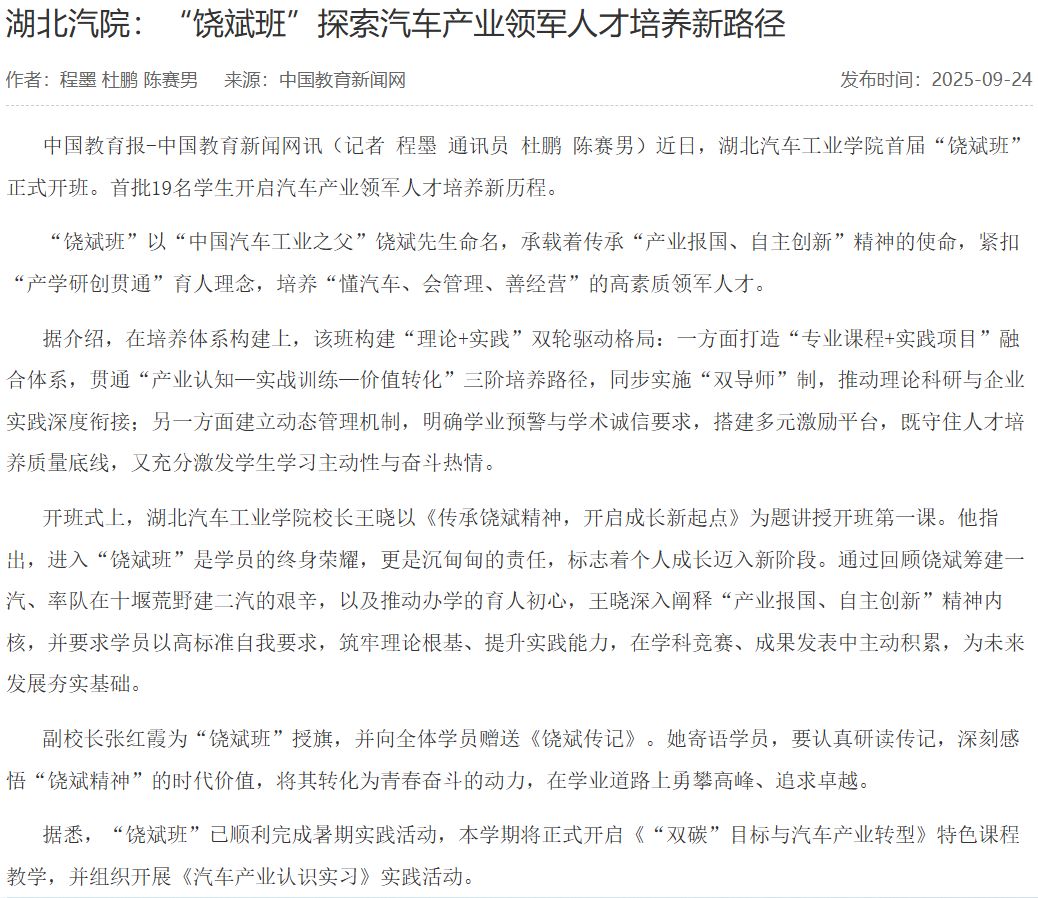 【中国教育报】湖北汽院:“饶斌班”探索汽车产业领军人才培养新路径