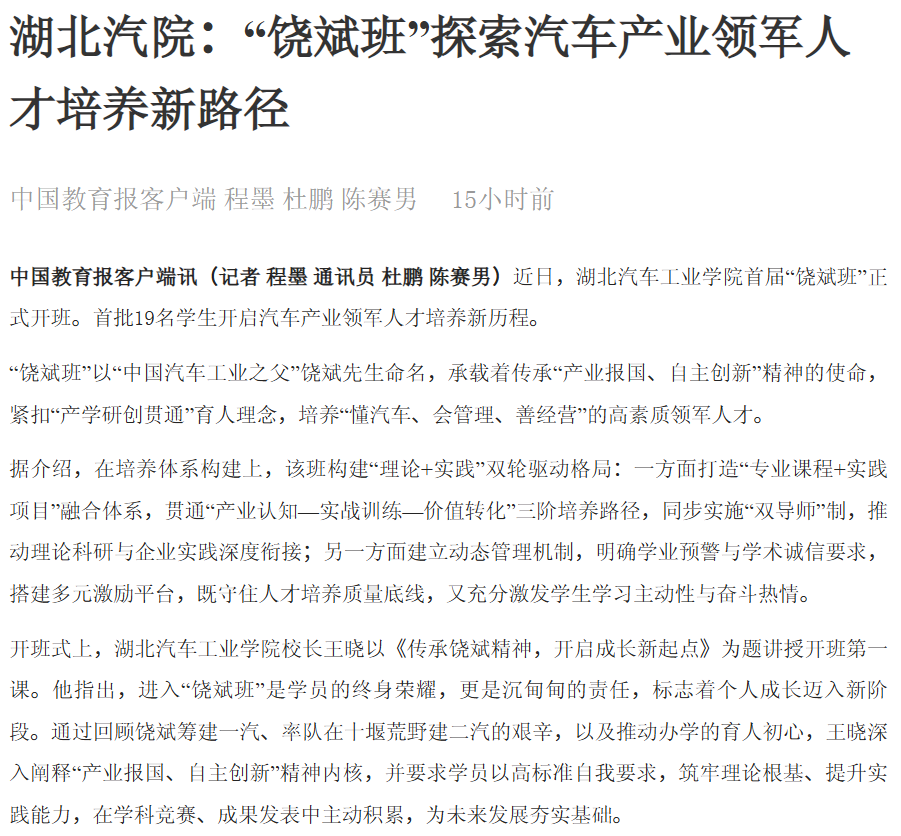 【中国教育报】湖北汽院:“饶斌班”探索汽车产业领军人才培养新路径