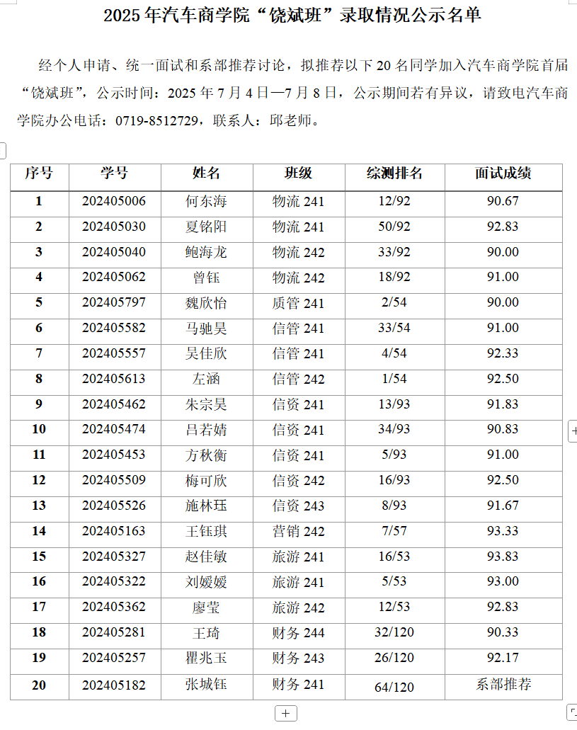 2025年太阳集团网站8722“饶斌班”录取情况公示名单